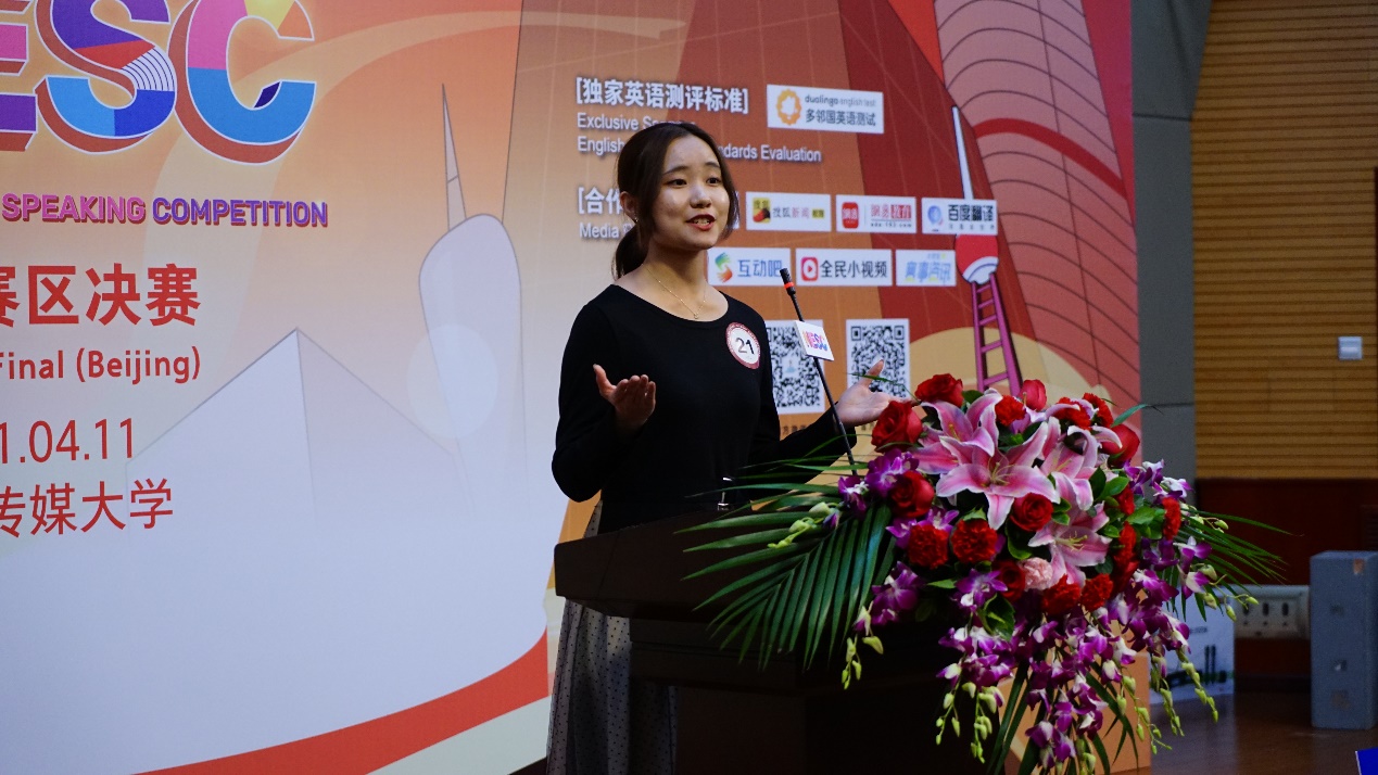 比赛中选手们就“保护蓝色星球” (Protecting the blue planet) 这一主题发表演讲并即席回答评委提问。韩书缘以化妆品为例,讲述了人类行为对地球环境的影响。她的演讲既具科学色彩,又有人文底蕴,回答问题既到位,又机智。大赛评委由来自北京各大高校的教授和中国日报社的资深专家们组成。